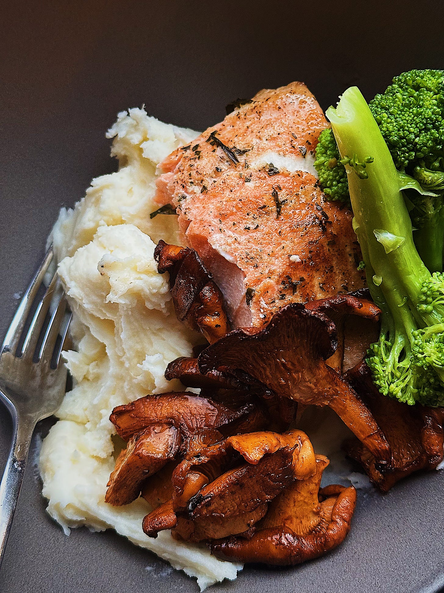 Creamy mashed potatoes, steamed broccoli, pan seared salmon and butter fried chanterelles. Want a delicious, comforting and unexpected combo.