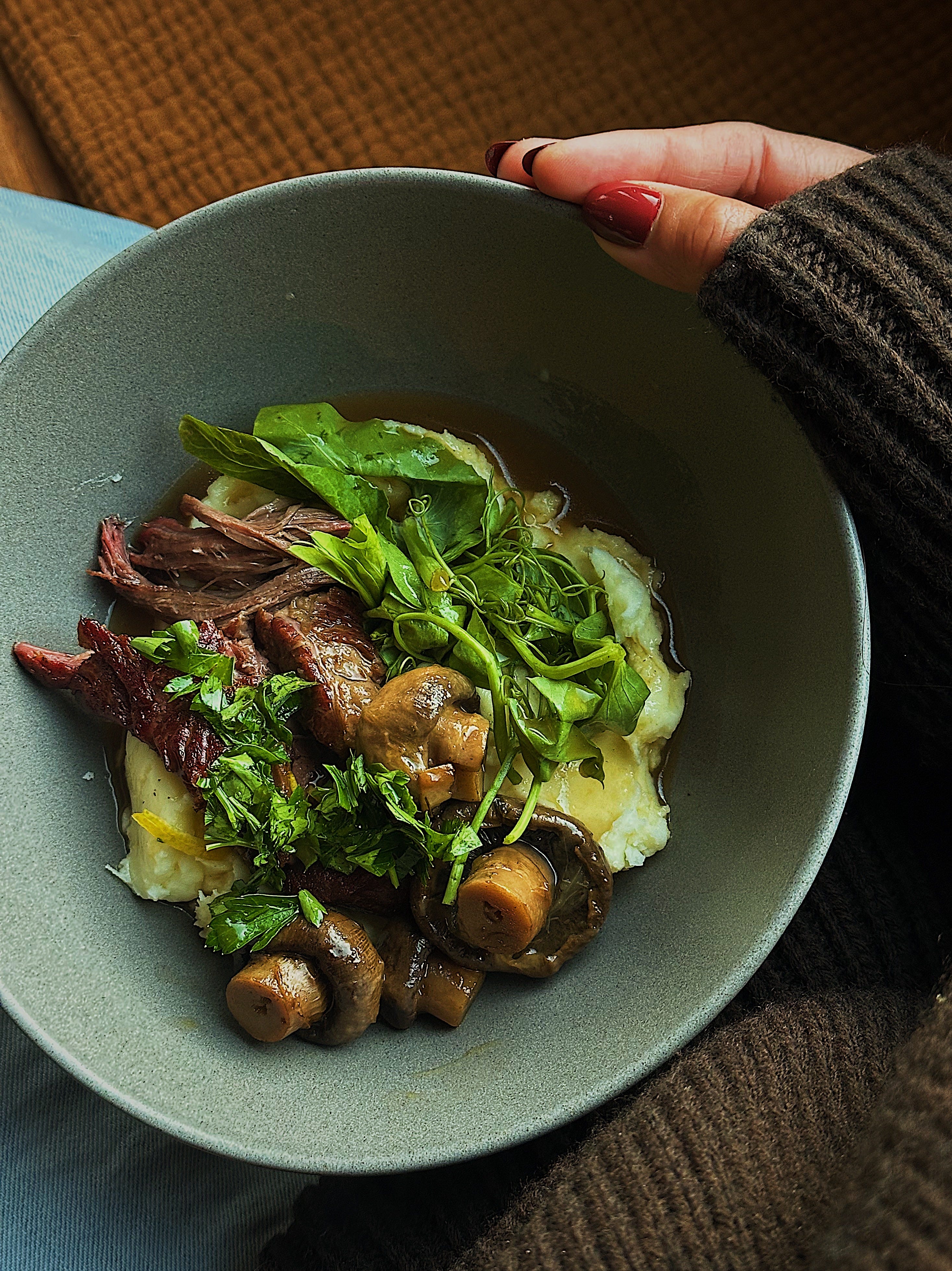 The house is filled with the rich smell of pot roast and fall. We fill our bowls with mashed potatoes, beef roast, mushrooms, gremolata, and red wine vinegar dressed pea shoots. The combination is comforting and bright, a perfect end to our Sunday.