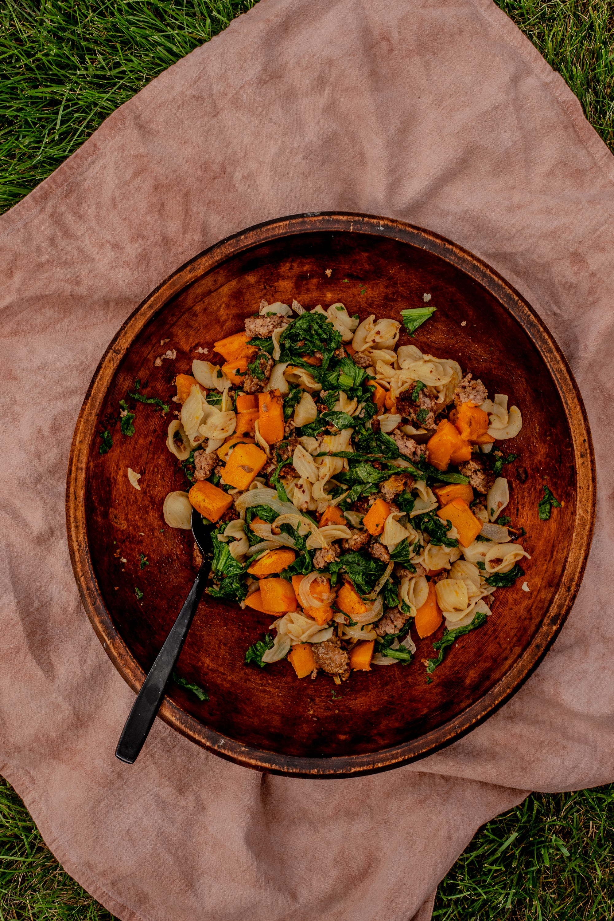 Roasted cubed squash, browned sausage, and wilted mustard greens tossed together with Orecchiette is fall in a bowl. This recipe is based on my friend Lara’s take, and it is for sure going to be on repeat this winter.