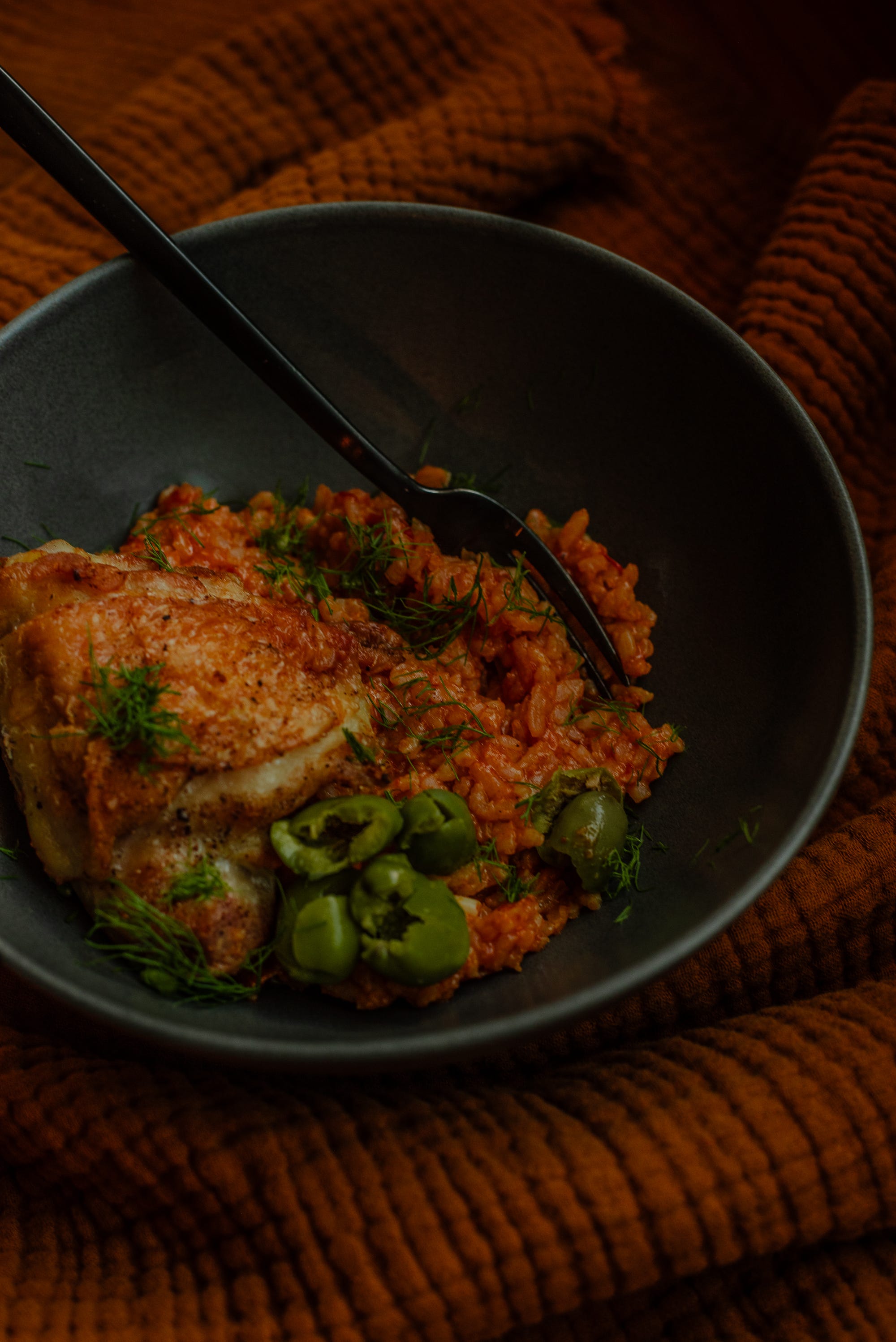 This was my attempt to make a tomato-y rice and chicken dish that bakes at the same time and comes together as a complete dish. I want to play with the rice seasoning, it felt a little flat, but still comforting and the chicken is crispy and so lovely.