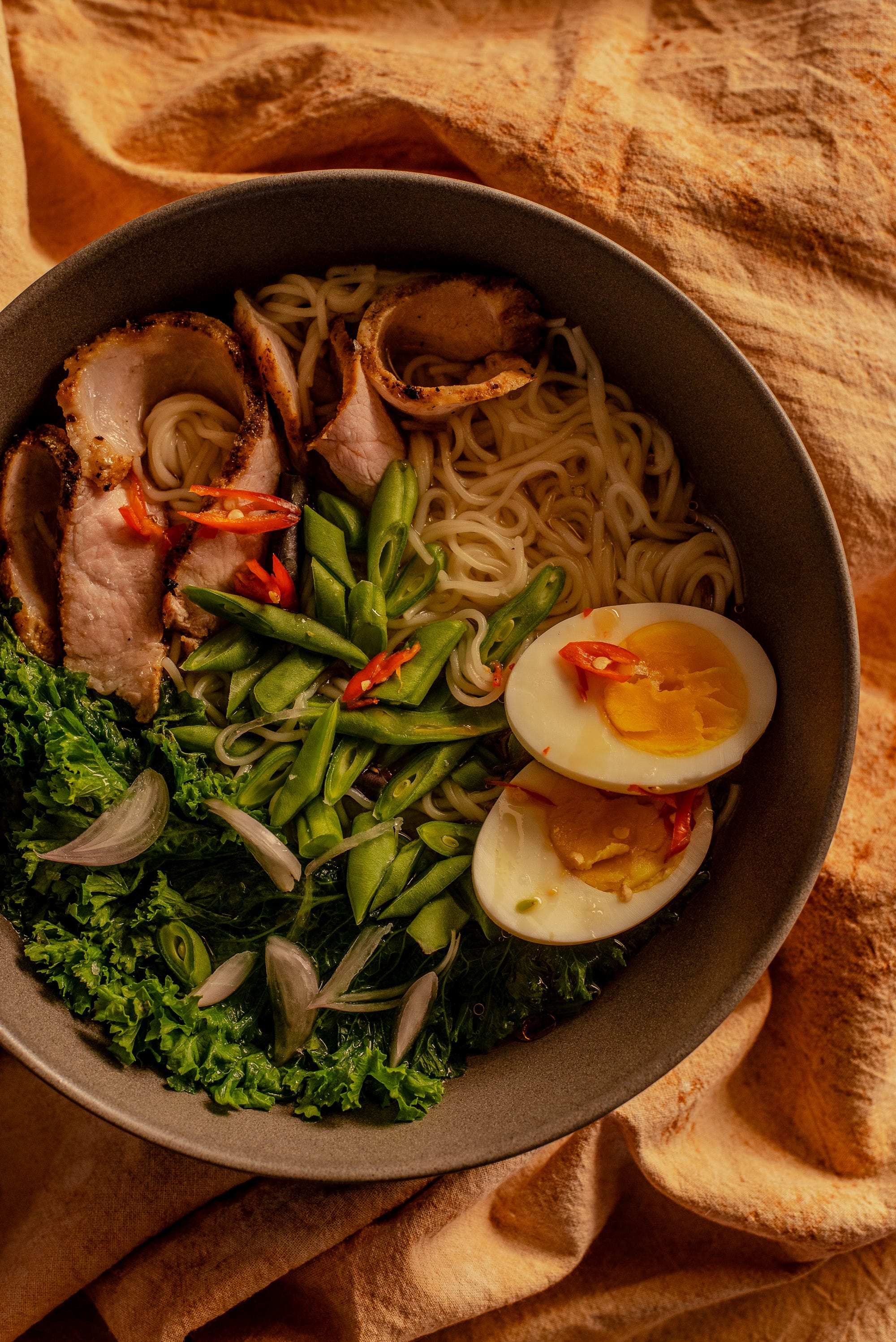 Chicken stock, packet ramen noodles, topped with leftover sliced pork chop, slivered snap peas, mustard greens, jammy egg, Thai chili and shallot. Resourceful and delicious.