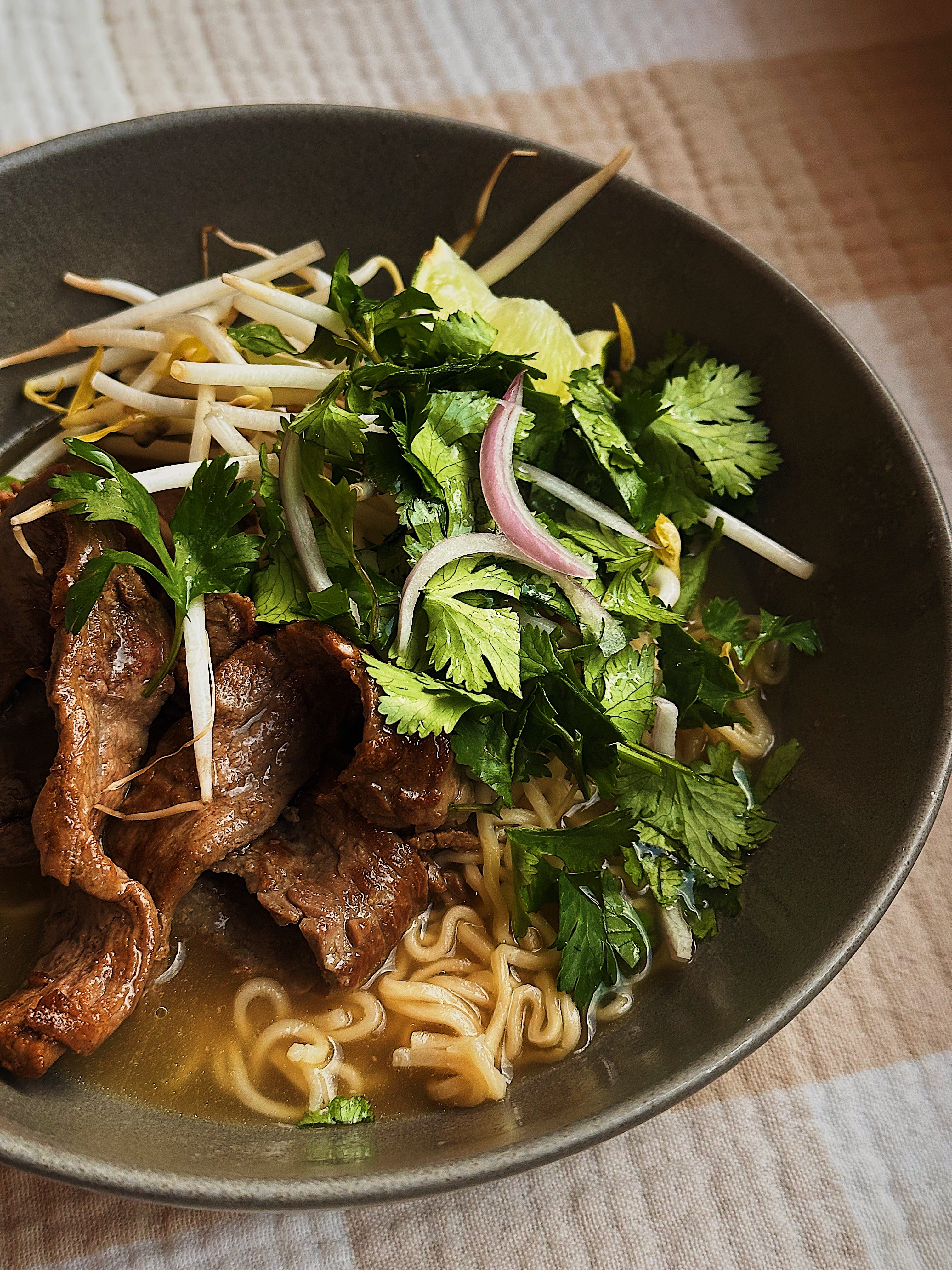 Was craving pho, made it as close as I could from what we had on hand. I started with a riff on Uyen Luu pho broth from Quick & Easy Vietnamese, ramen noodles, market fresh bean sprouts, shallot and cilantro, thinly sliced flank steak seasoned with with soy sauce and garlic and quick pan fried. Topped it with tons of lime juice. It was so lovely. Here is the broth recipe.