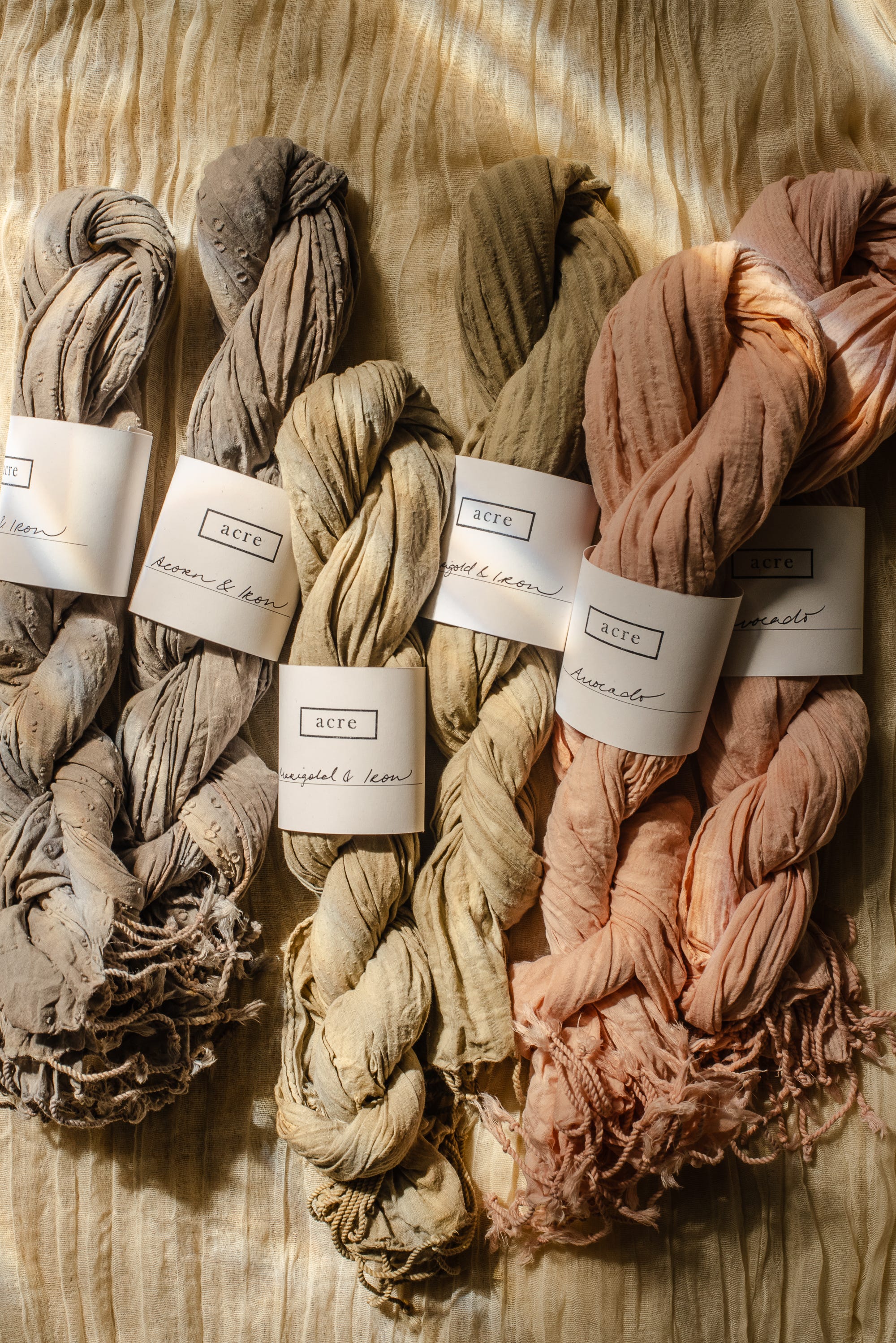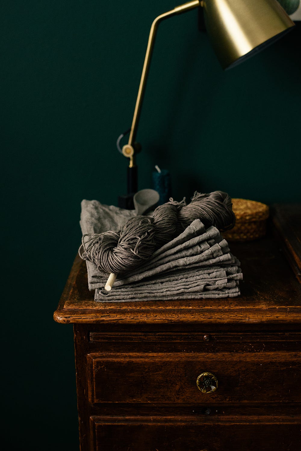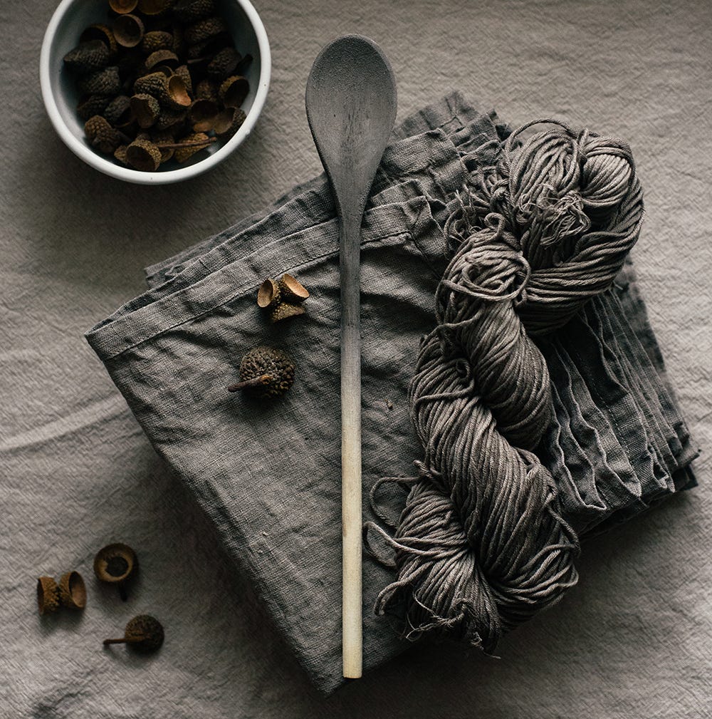 I have dyed a range of different fabrics and yarns in acorn dye, and found that dyeing linen napkins has been my favorite. It creates an incredibly rich table setting, adding warmth and earthiness to a winter dinner table. I love the idea of bringing the outdoors in during a season when not much can be gleaned from the outdoors. The linen also takes to acorn dye really well, making it a great first acorn dye project.