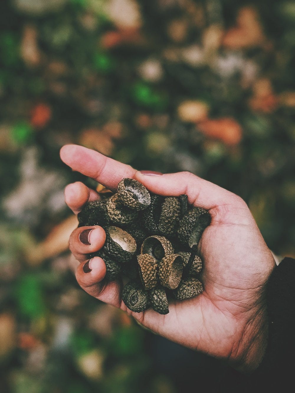 As you start working with acorn dye, know both the caps and nuts hold dye potential, and can be used at any point from when they have fallen off the tree before becoming a sapling. Remember with any foraged material to only take a small portion, leaving the rest for wildlife and new growth.