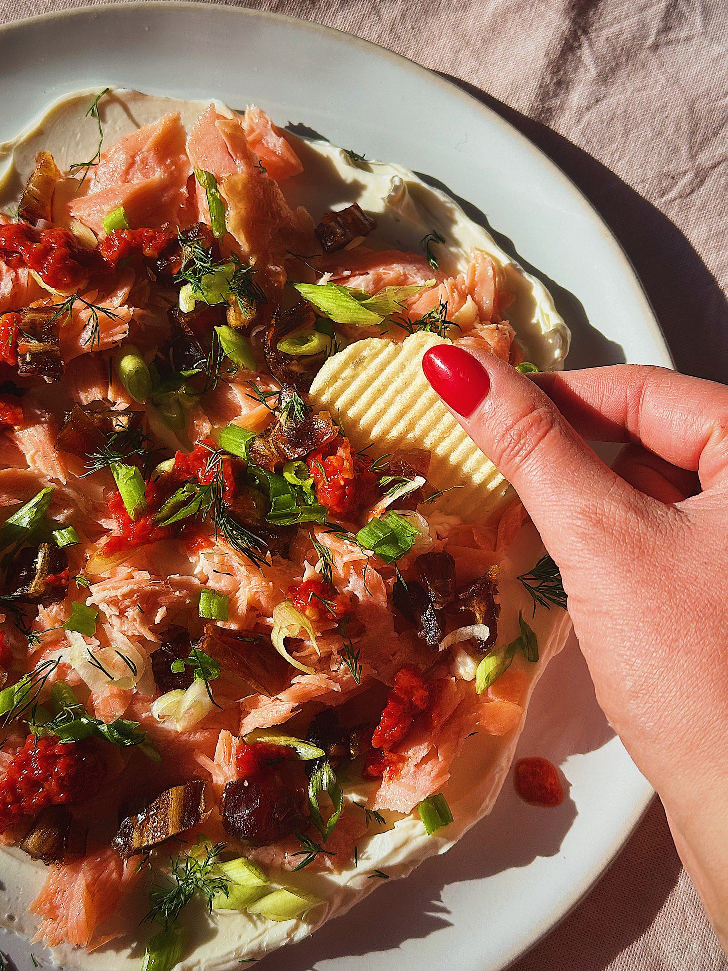 Gently flake the smoked salmon with your hands, arranging it evenly over the cream cheese.