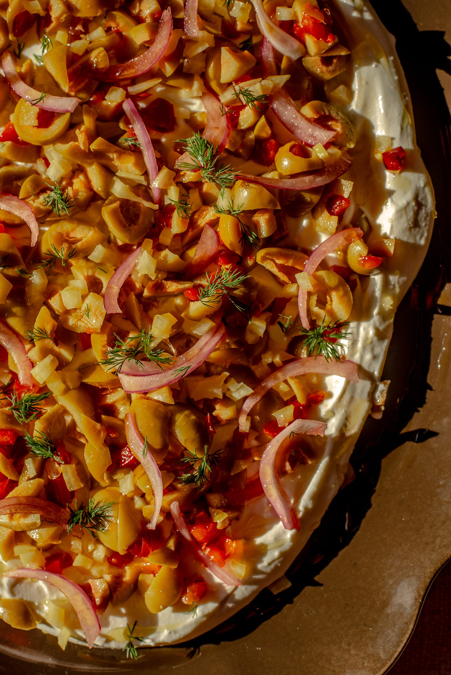 Spread the feta mixture onto a large platter and top with the chopped martini olives, chopped preserved lemon, pickled red onion slices, a drizzle of olive oil and fresh dill. Enjoy!