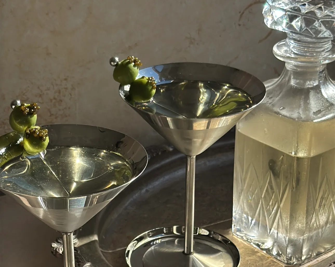 Let’s start with a dip that doubles down on olives– Julianna McIntosh Freeze door martini and caviar stuffed olives. So elevated and fun, they would be perfect in the Piano Cocktail Glasses.