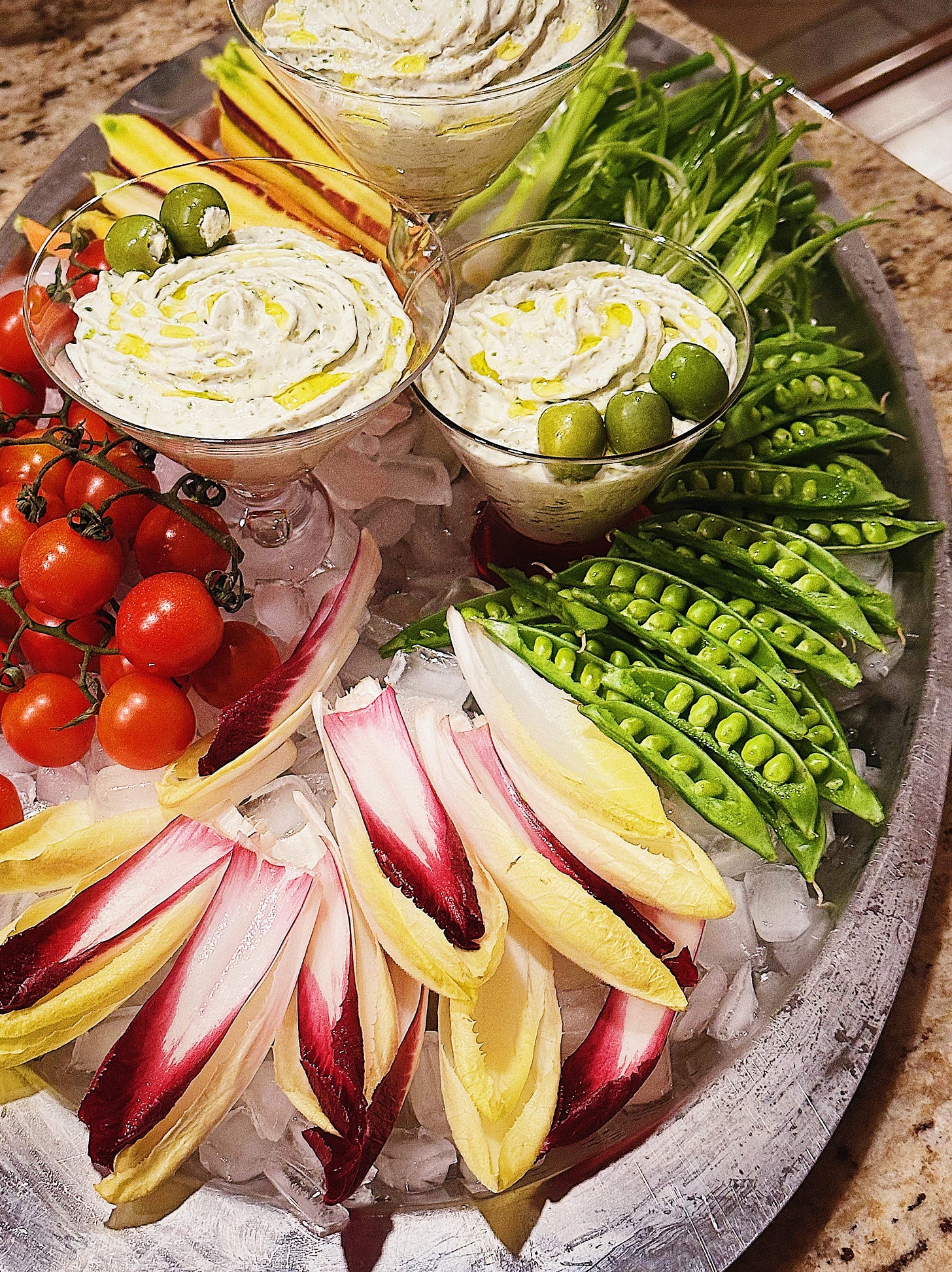 Serve with crudités (endive, snap peas, carrots, radishes, green onions, cherry tomatoes) on ice.