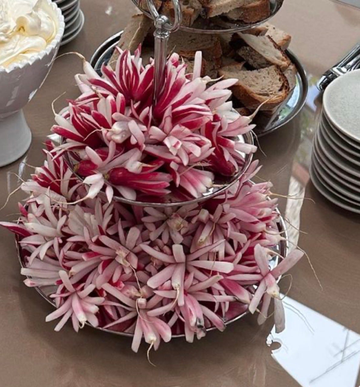 Vintage silver serve ware is seeing a resurgence, and I am here for it. I love the addition of metal, the sheen and shine elevate with little effort. Practically, metal dishes are a great addition as they naturally stay cold, making it great for cold dips, shrimp or crudités. Here are all the metal serve ware I pulled for this spread: Two tiered snack tray, Stainless Steel Ice Bucket, metal platter, Seashell Tongs