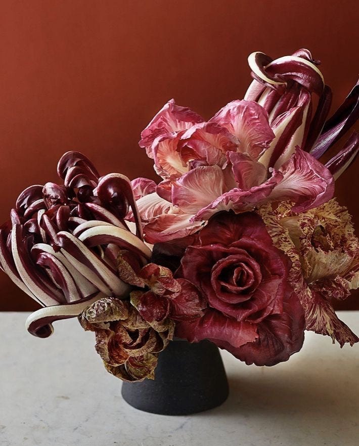I do believe a Thanksgiving table needs a full and bountiful centerpiece, preferring for the platters of food to be arranged as a kitchen island buffet. Thanksgiving is the perfect moment to style with food, harkening back to the classic cornucopia as inspiration. I would take a fresh approach to this and create a radicchio-copia–a tumbling cascade of a variety of colors, shapes and textures across the center of the table–inspired by Rivki Rabinowitz note. I would arrange these beauties around this wavy candle holder with pink candlesticks for a modern and playful touch.