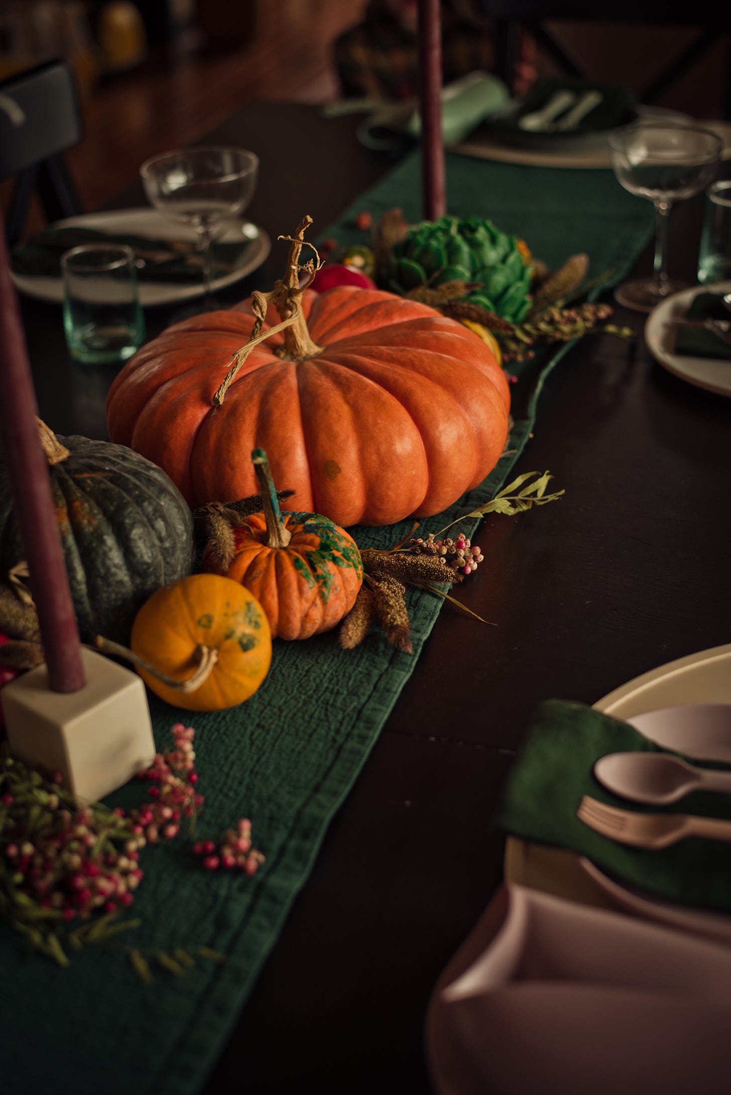Thanksgiving is family-style food and needs a table that invites this. I have chosen an overall aesthetic that feels more comfortable and casual, grounding the table with a burgundy gingham tablecloth and adding dishes that nod to vintage your grandmother would have owned, like this dotted serving platter, deep purple pie dish and ochre plates. For contrast and playfulness, I would add these citrine glasses to break up the red and umber.