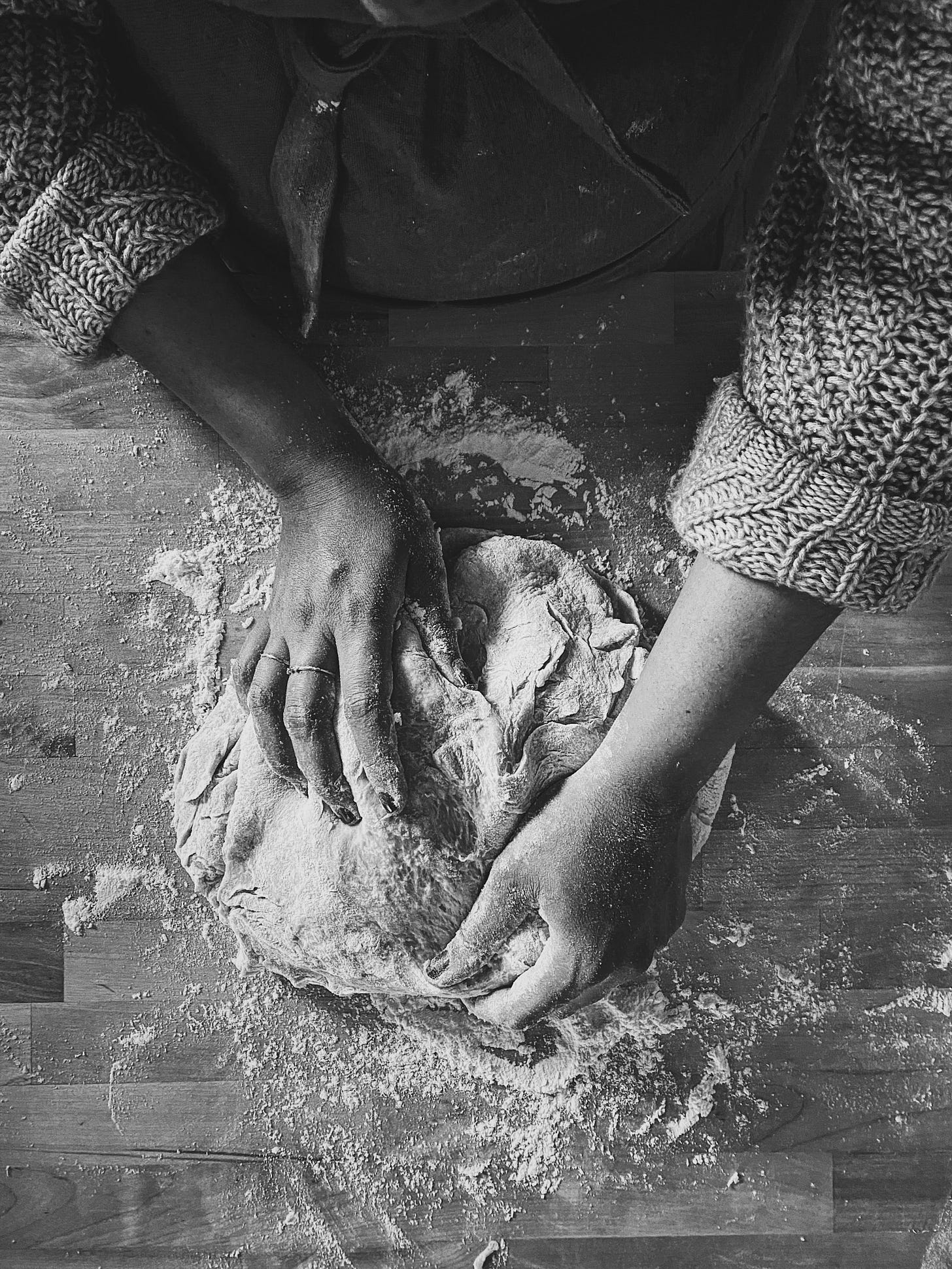I pull the scale from the drawer, heft the largest bowls from the cabinet and set to measuring. Flour, water, salt and starter come together with each turn of the whisk. Sticky and craggy the dough clings together into a slowly defining mass. Dumped on a floured counter I knead, push and pull, stretch and fold until a smooth, elastic dough ball forms. Perfectly round and contained, nothing like the individual elements not long ago. The precious orb is placed in a proofing box to rise and fill its containment.