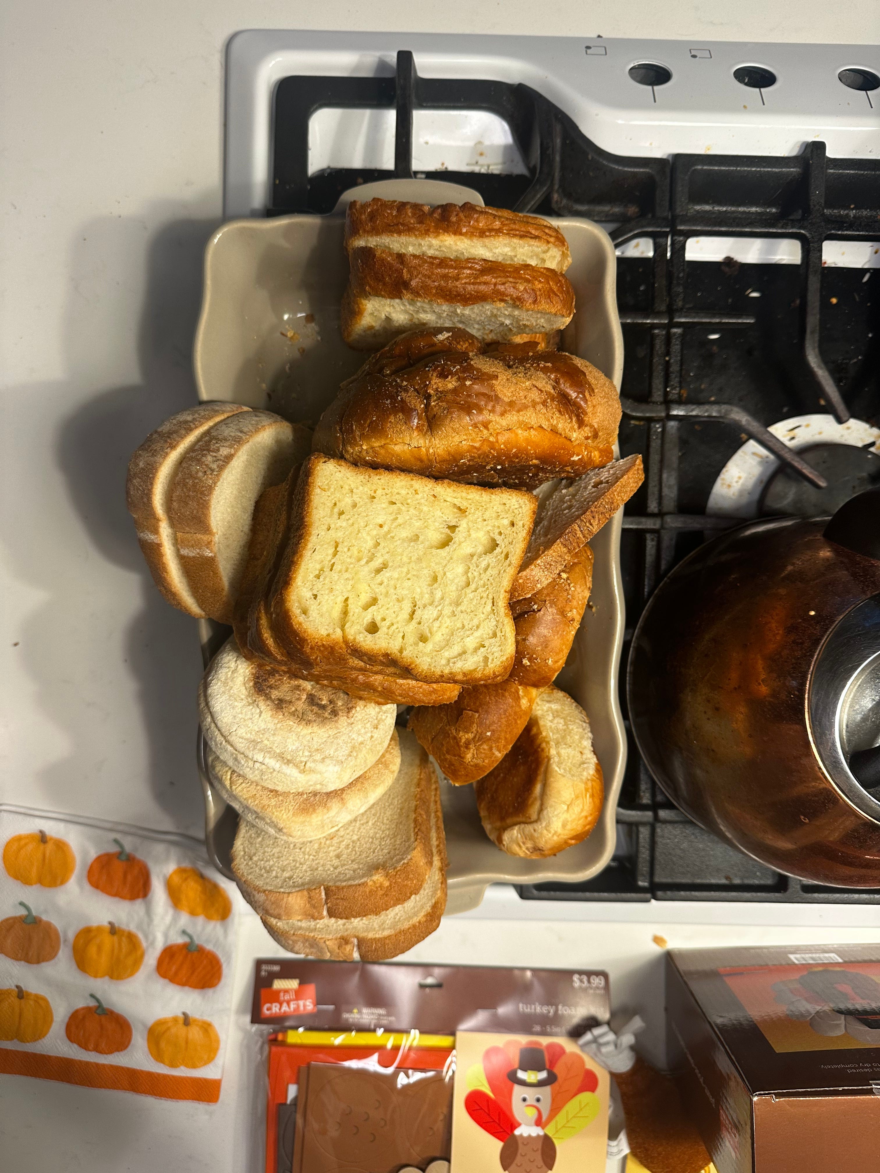Leslie’s Thanksgiving stuffing completely reframed my way of thinking about leftover bread wedges. The remains became like bread Polaroids–each piece holding memories, images in my mind of the moment it was baked, gifted, enjoyed. The culmination of a single dish–the bread photo album if you will–a brimming pan of plenty, of abundance, of all the bread shared–the people, community, connections–to be grateful for.