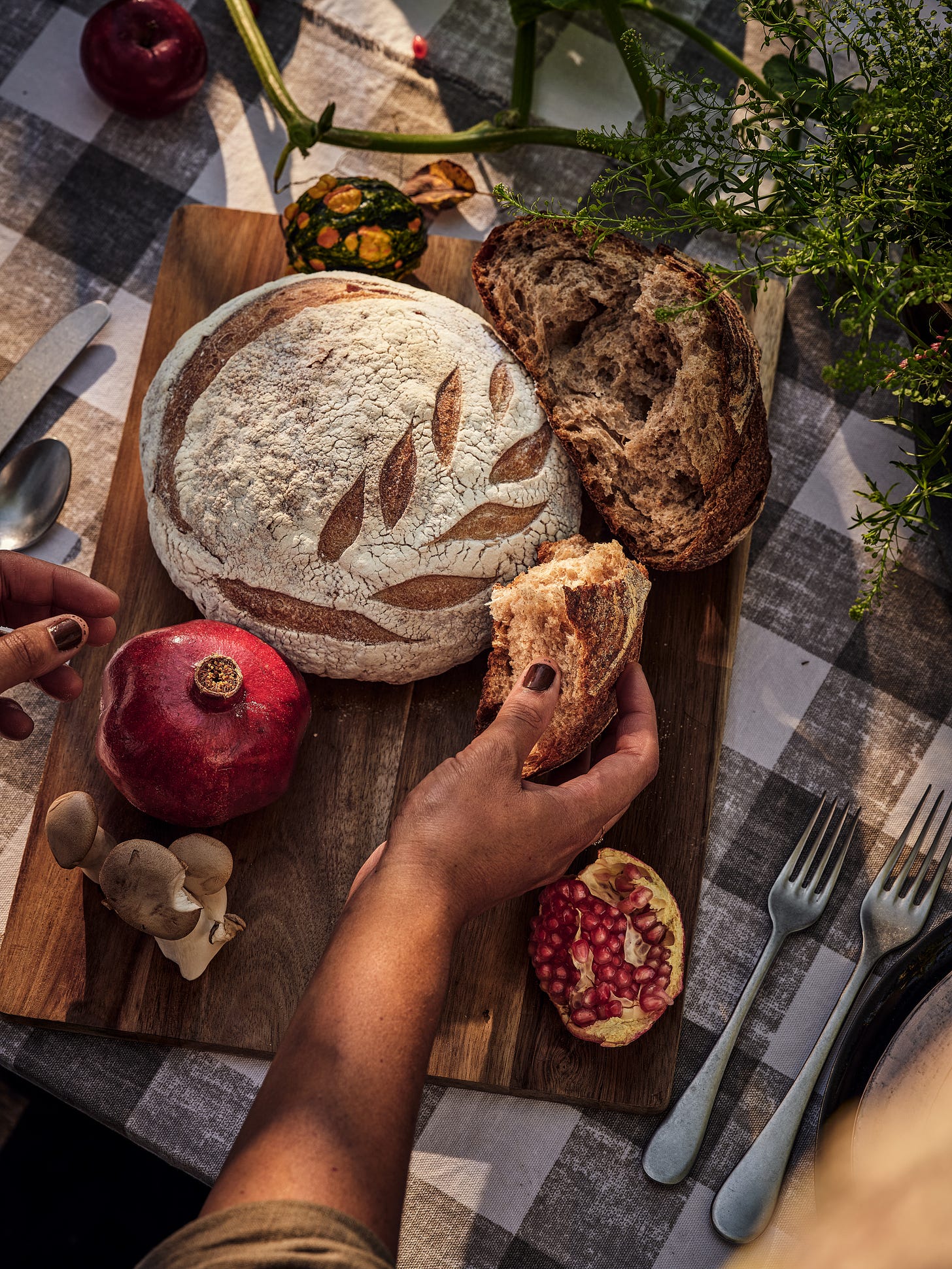 From there the soft dough is shaped into loaves, set again to rise and finally, finally, to bake. The cloche is lifted and a cloud of steam escapes, beneath the haze a risen loaf is there to greet me. A further bake results in a rich brown crust, pulled from the oven when just the right deep color. The bread crackles, a sound only fresh bread makes, its smell filling the house with a yeasty, comforting warmth. The bread has rested and it is time to enjoy.